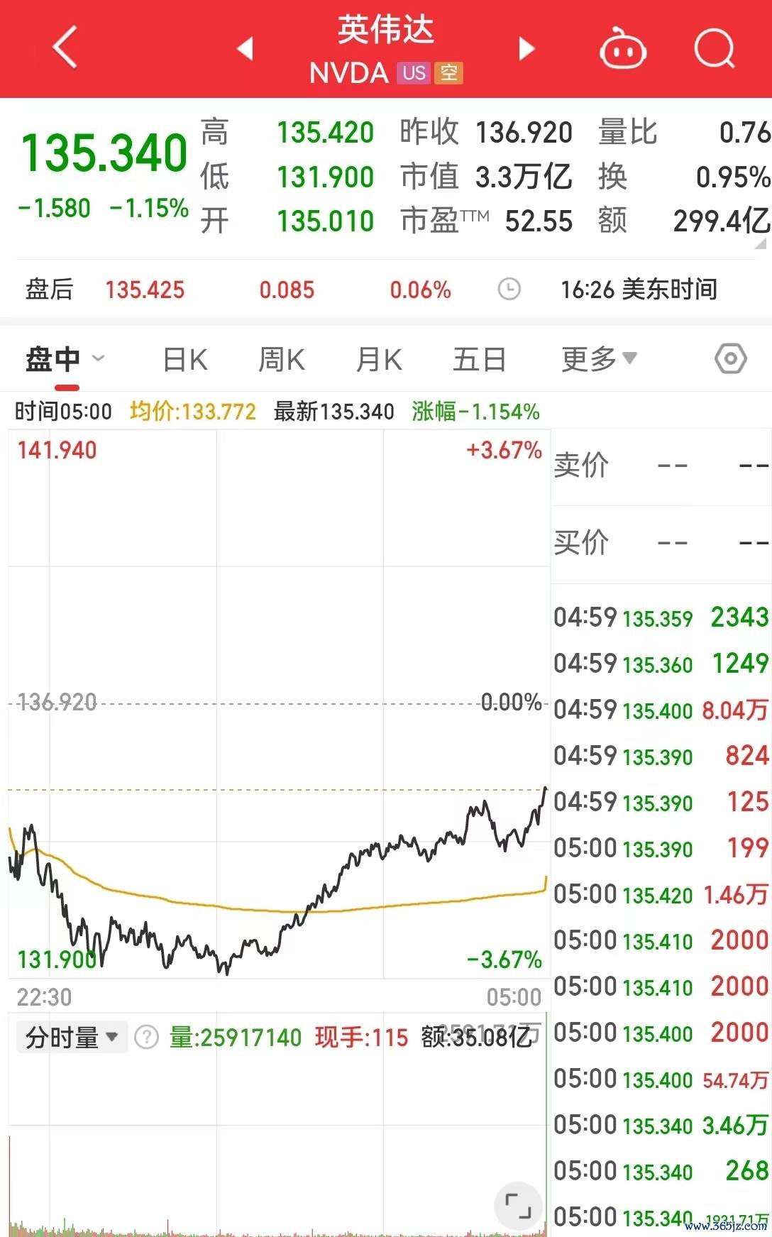 “科技七姐妹”多數(shù)下跌。特斯拉跌1.58%;谷歌A漲0.07%;蘋果跌0.06%;Meta跌0.761%;亞馬遜跌1.02%;英偉達(dá)一度跌超3.5%,截至收盤跌1.15%。